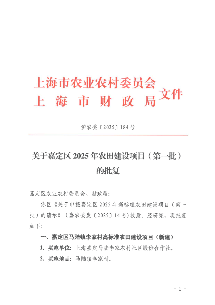 你区《关于申报嘉定区2025年高标准农田建设项目(第一批)的请示》(嘉农委发〔2025〕14号)收悉。经研究,现批复如下: