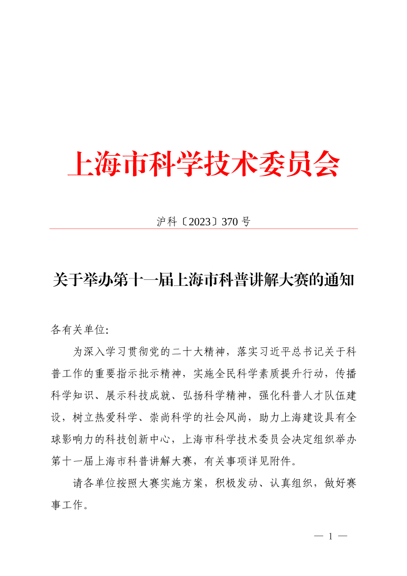 为深入学习贯彻党的二十大精神,落实习近平总书记关于科普工作的重要指示批示精神,实施全民科学素质提升行动,传播科学知识、展示科技成就、弘扬科学精神,强化科普人才队伍建设,树立热爱科学、崇尚科学的社会风尚,助力上海建设具有全球影响力的科技创新中心,上海市科学技术委员会决定组织举办第十一届上海市科普讲解大赛,有关事项详见附件。