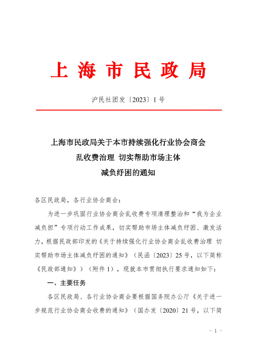 为进一步巩固行业协会商会乱收费专项清理整治和“我为企业减负担”专项行动工作成果,切实帮助市场主体减负纾困、激发活力,根据民政部印发的《关于持续强化行业协会商会乱收费治理 切实帮助市场主体减负纾困的通知》(民函〔2023〕25号,以下简称《民政部通知》)(附件1),现就本市贯彻执行要求通知如下: