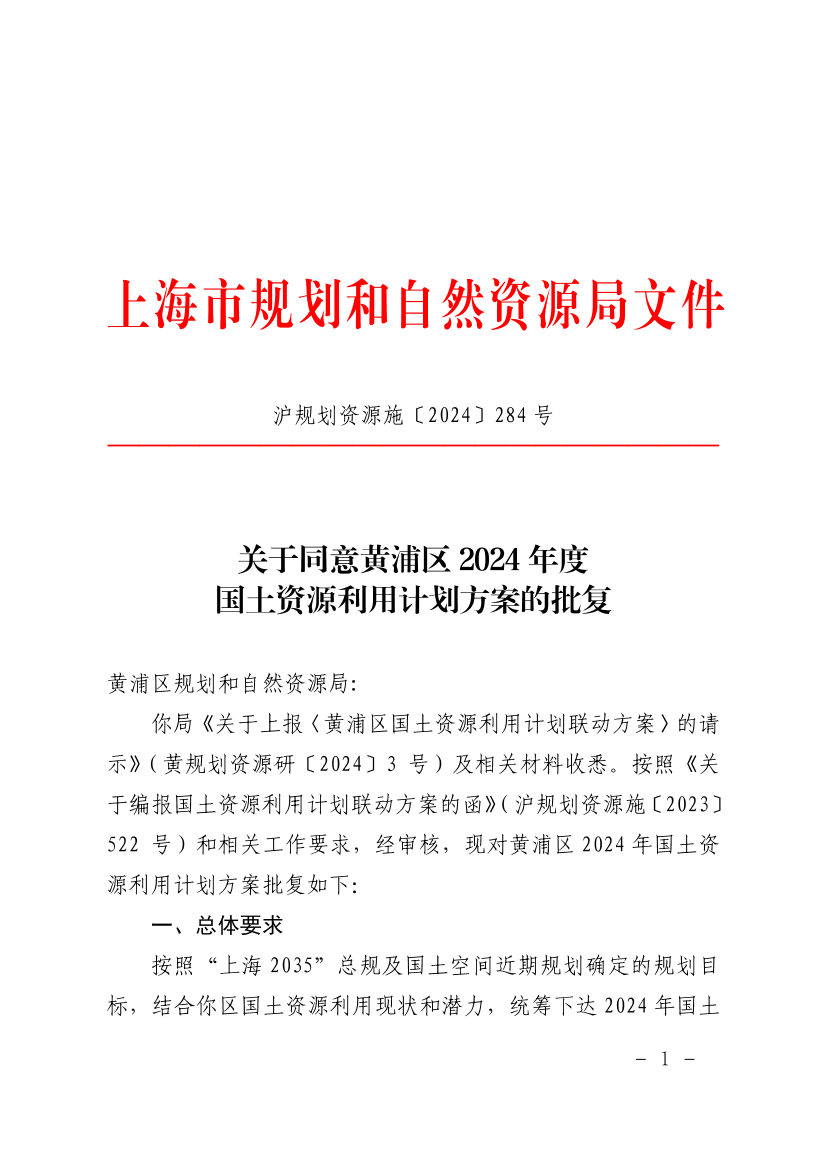 你局《关于上报〈黄浦区国土资源利用计划联动方案〉的请示》(黄规划资源研〔2024〕3 号)及相关材料收悉。按照《关于编报国土资源利用计划联动方案的函》(沪规划资源施〔2023〕522 号)和相关工作要求,经审核,现对黄浦区2024年国土资源利用计划方案批复如下: