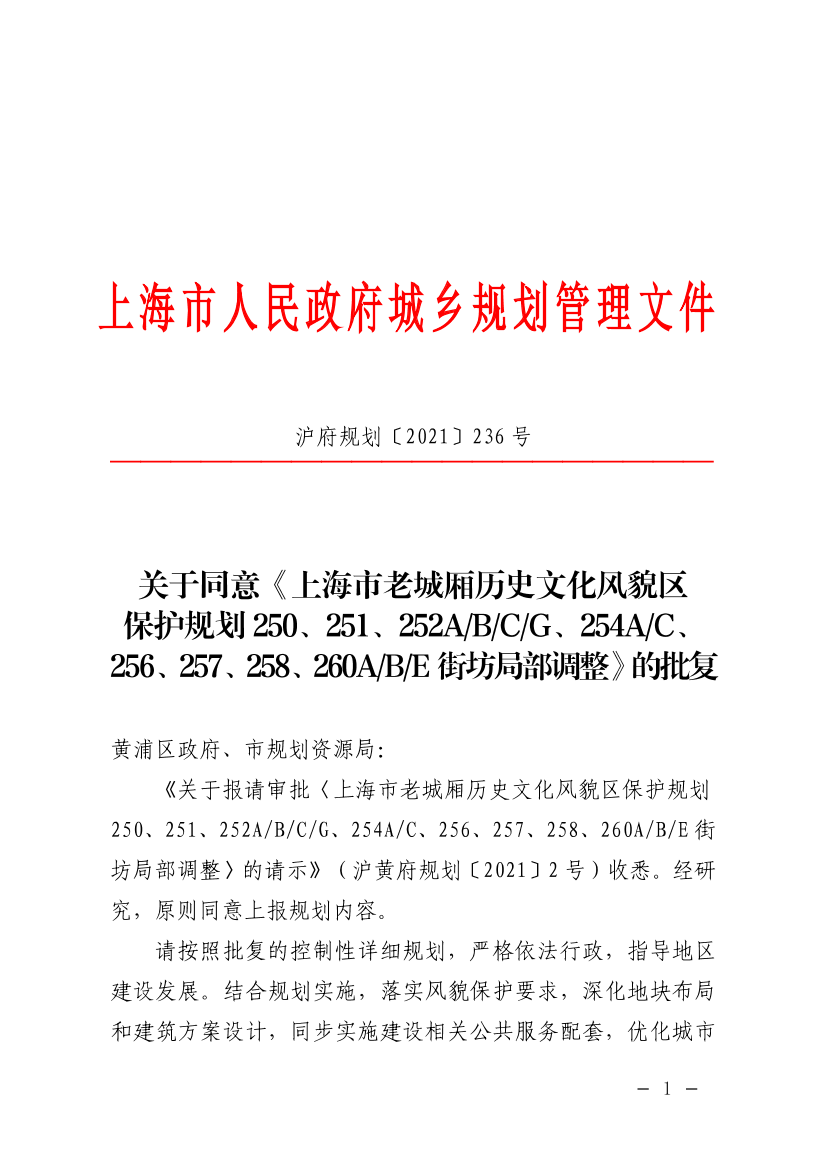 《关于报请审批〈上海市老城厢历史文化风貌区保护规划250、251、252A/B/C/G、254A/C、256、257、258、260A/B/E街坊局部调整〉的请示》(沪黄府规划〔2021〕2号)收悉。经研究,原则同意上报规划内容。