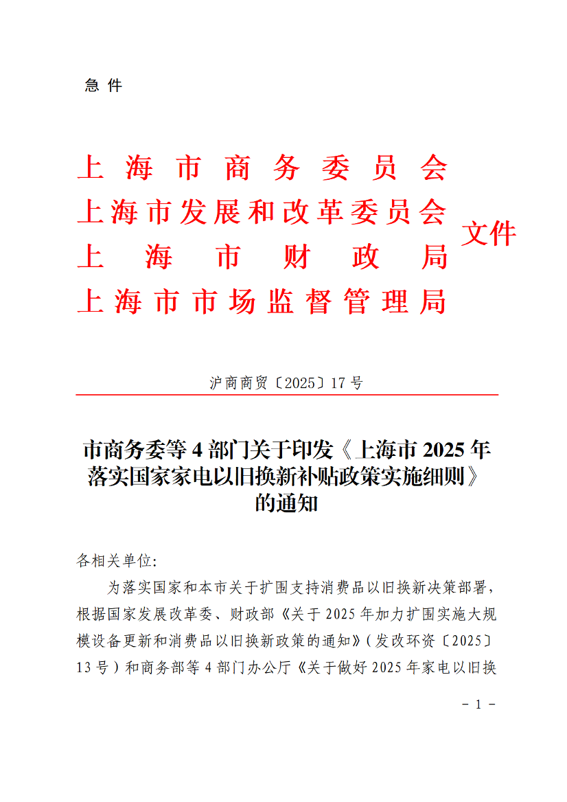 为落实国家和本市关于扩围支持消费品以旧换新决策部署,根据国家发展改革委、财政部《关于2025年加力扩围实施大规模设备更新和消费品以旧换新政策的通知》(发改环资〔2025〕13号)和商务部等4部门办公厅《关于做好2025年家电以旧换新工作的通知》(商办流通函〔2025〕6号)要求,现印发《上海市2025年落实国家家电以旧换新补贴政策实施细则》,请认真贯彻执行。