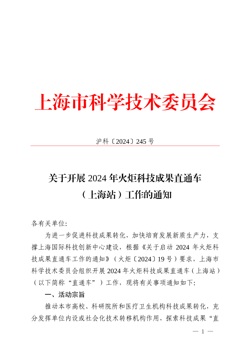 为进一步促进科技成果转化,加快培育发展新质生产力,支撑上海国际科技创新中心建设,根据《关于启动2024年火炬科技成果直通车工作的通知》(火炬〔2024〕19号)要求,上海市科学技术委员会组织开展2024年火炬科技成果直通车(上海站)(以下简称“直通车”)工作,现将有关事项通知如下: