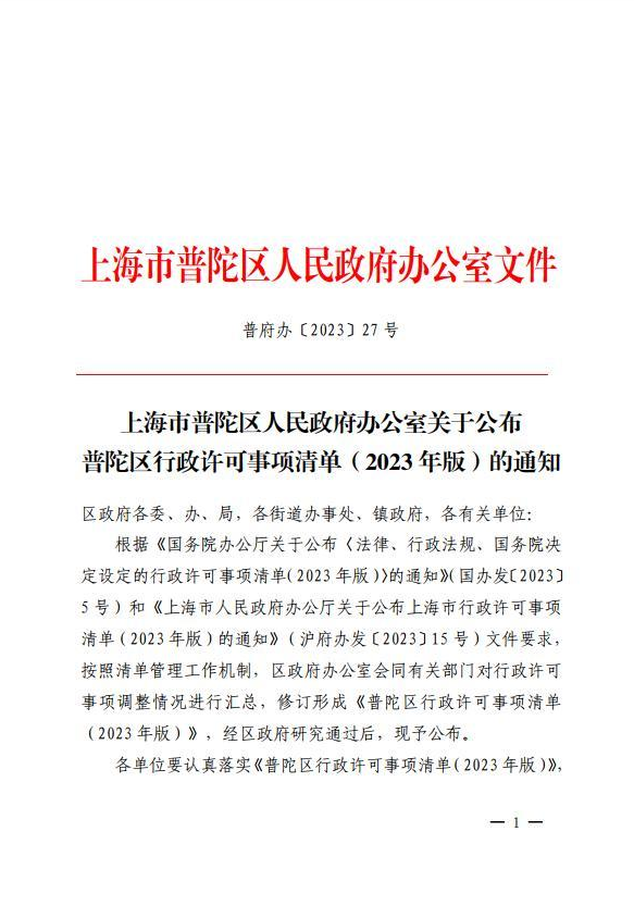 普陀区行政许可事项清单(2023年版)