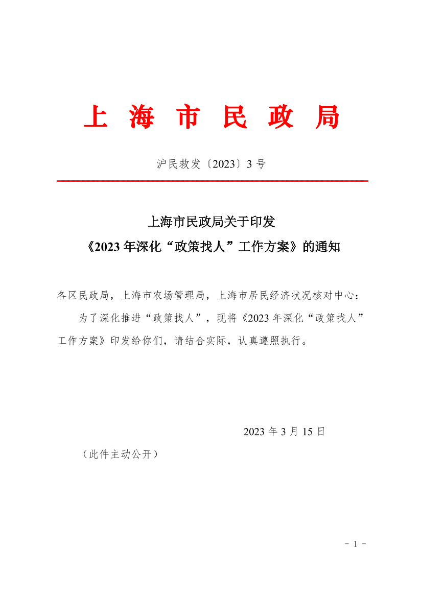为全面贯彻落实党的二十大精神,深入践行“人民至上”重要理念,进一步优化主动发现综合帮扶工作机制,精准规范兜住兜准兜好民生底线,现就2023年继续深化社会救助领域“政策找人”工作,制定如下方案。