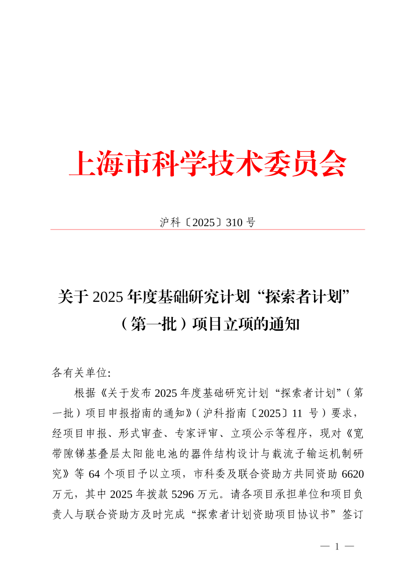 根据《关于发布2025年度基础研究计划“探索者计划”(第一批)项目申报指南的通知》(沪科指南〔2025〕11号)要求,经项目申报、形式审查、专家评审、立项公示等程序,现对《宽带隙锑基叠层太阳能电池的器件结构设计与载流子输运机制研究》等64个项目予以立项,市科委及联合资助方共同资助6620万元,其中2025年拨款5296万元。请各项目承担单位和项目负责人与联合资助方及时完成“探索者计划资助项目协议书”签订工作,并做好项目组织实施和管理工作,确保按期完成项目研究任务目标。