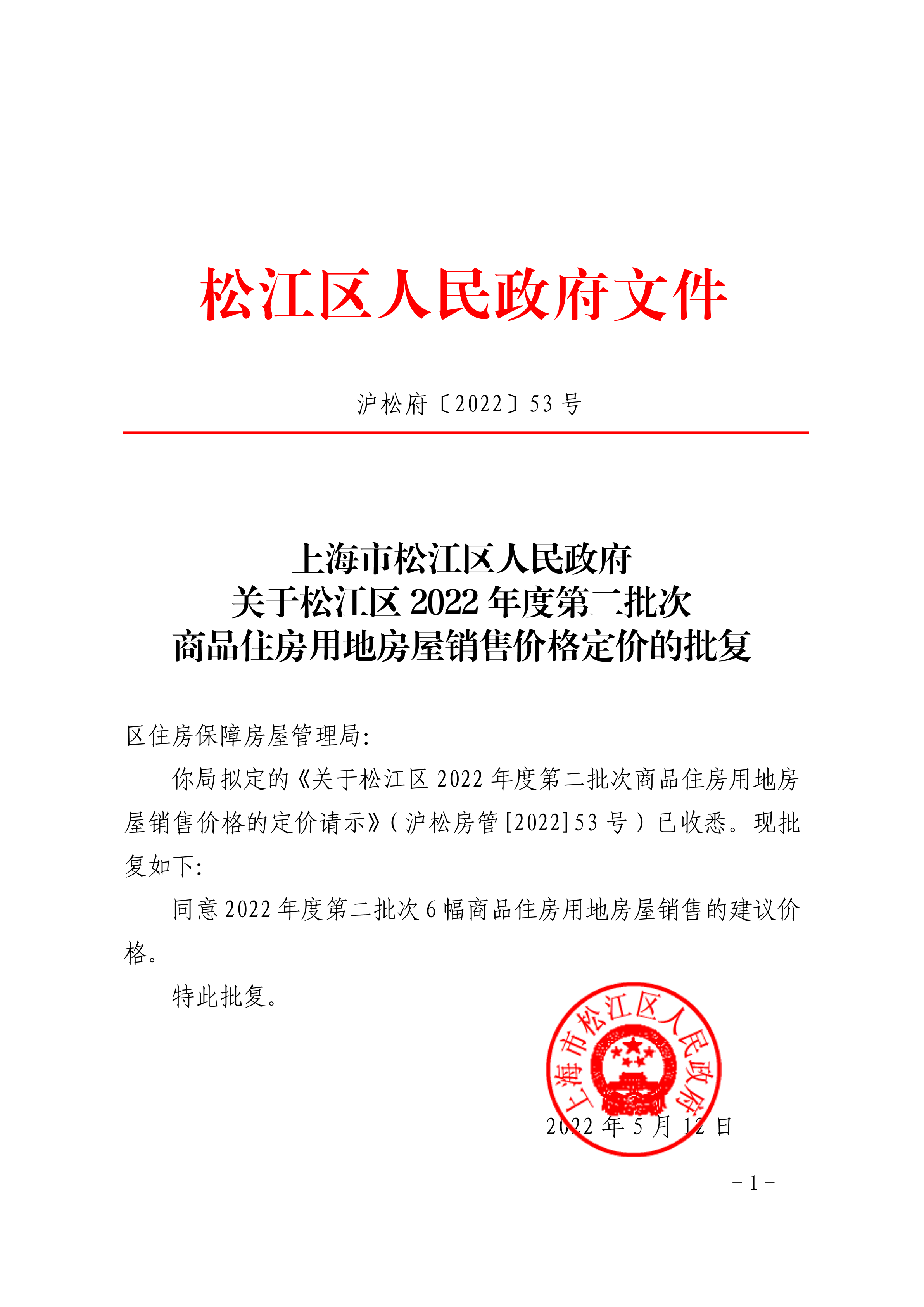 屋销售价格的定价请示》(沪松房管[2022]53号)已收悉。现批复如下: