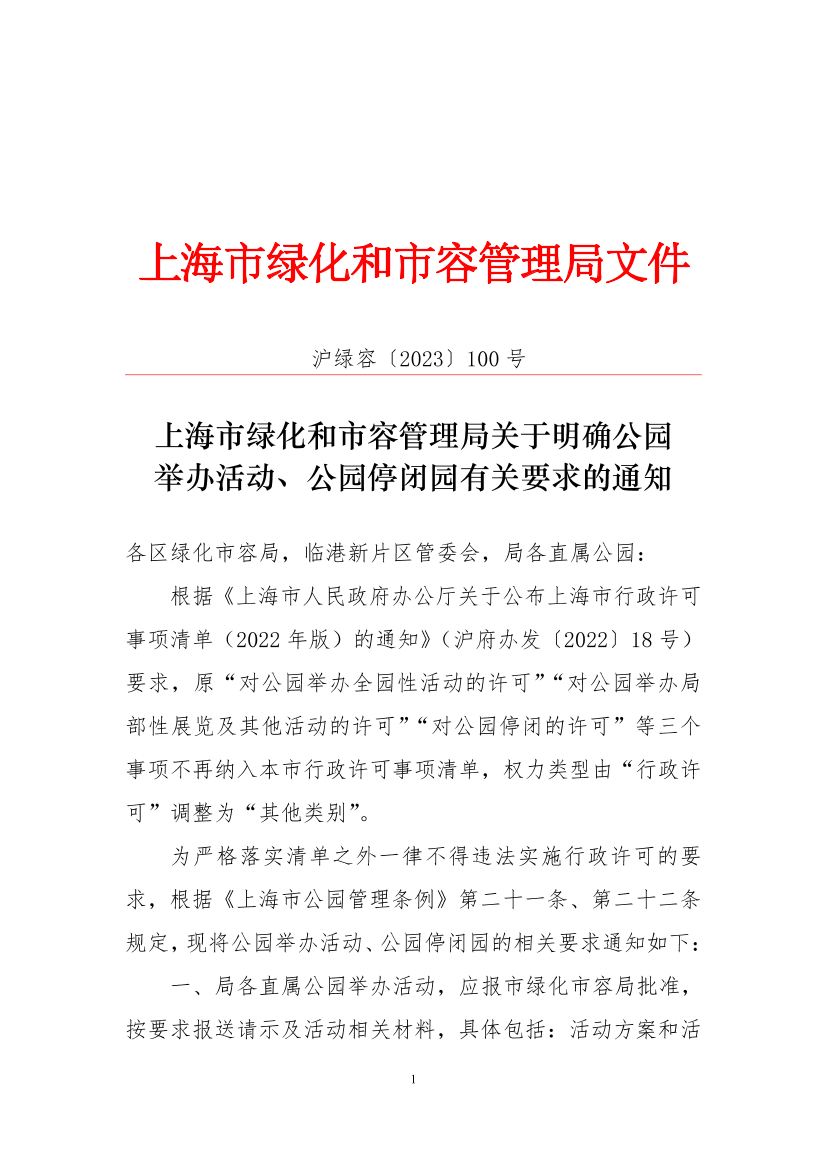 为严格落实清单之外一律不得违法实施行政许可的要求,根据《上海市公园管理条例》第二十一条、第二十二条规定,现将公园举办活动、公园停闭园的相关要求通知如下: