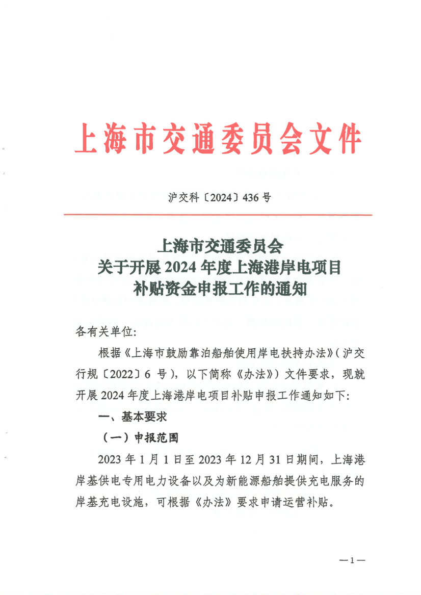 根据《上海市鼓励靠泊船舶使用岸电扶持办法》(沪交行规〔2022〕6号),以下简称《办法》)文件要求,现就开展2024年度上海港岸电项目补贴申报工作通知如下: