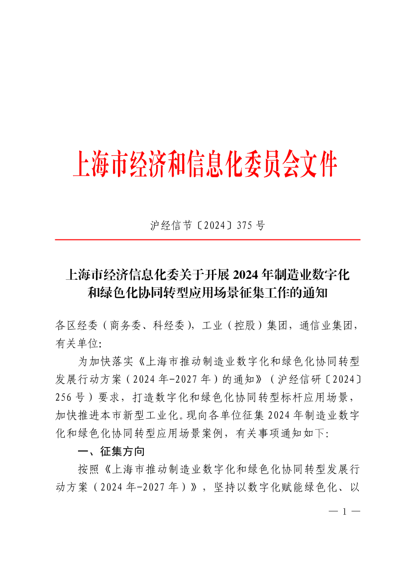 为加快落实《上海市推动制造业数字化和绿色化协同转型发展行动方案(2024年-2027年)的通知》(沪经信研〔2024〕256号)要求,打造数字化和绿色化协同转型标杆应用场景,加快推进本市新型工业化。现向各单位征集2024年制造业数字化和绿色化协同转型应用场景案例,有关事项通知如下:
