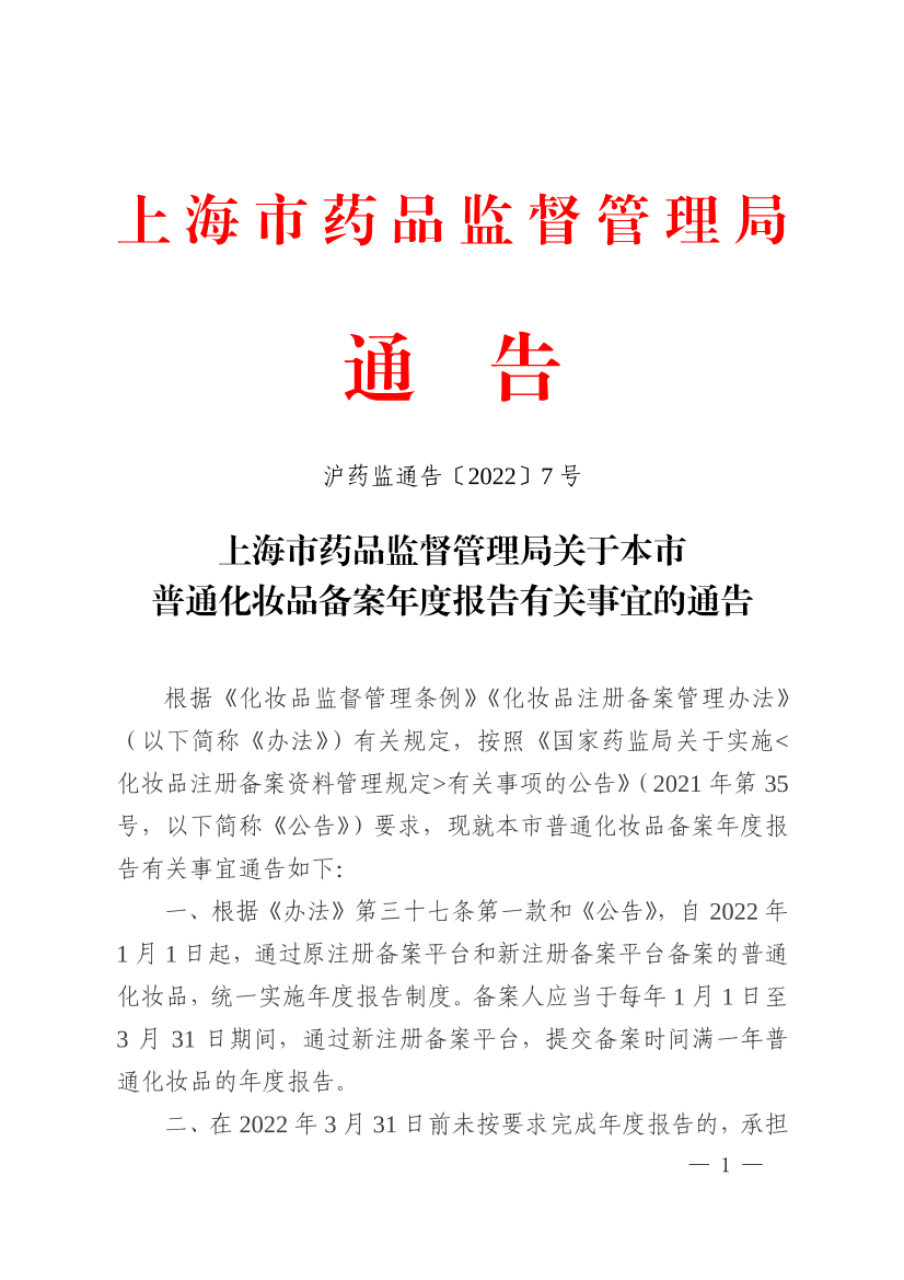 根据《化妆品监督管理条例》《化妆品注册备案管理办法》(以下简称《办法》)有关规定,按照《国家药监局关于实施<化妆品注册备案资料管理规定>有关事项的公告》(2021年第35号,以下简称《公告》)要求,现就本市普通化妆品备案年度报告有关事宜通告如下: