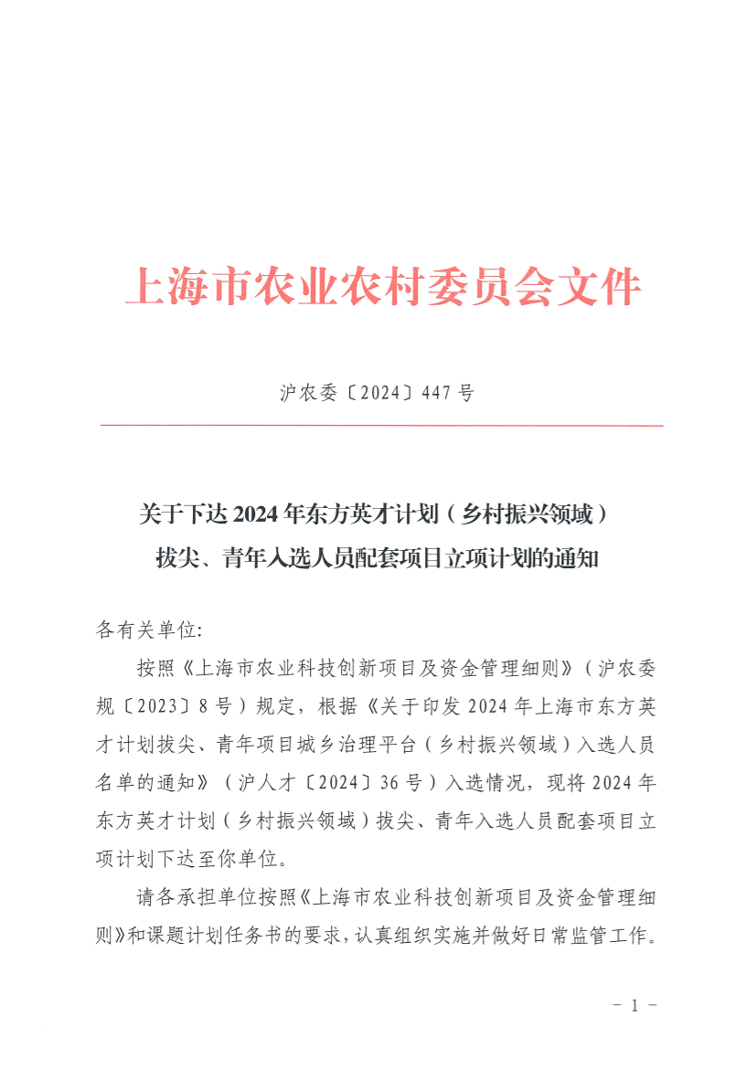 按照《上海市农业科技创新项目及资金管理细则》(沪农委规〔2023〕8号)规定,根据《关于印发2024年上海市东方英才计划拔尖、青年项目城乡治理平台(乡村振兴领域)入选人员名单的通知》(沪人才〔2024〕36号)入选情况,现将2024年东方英才计划(乡村振兴领域)拔尖、青年入选人员配套项目立项计划下达至你单位。