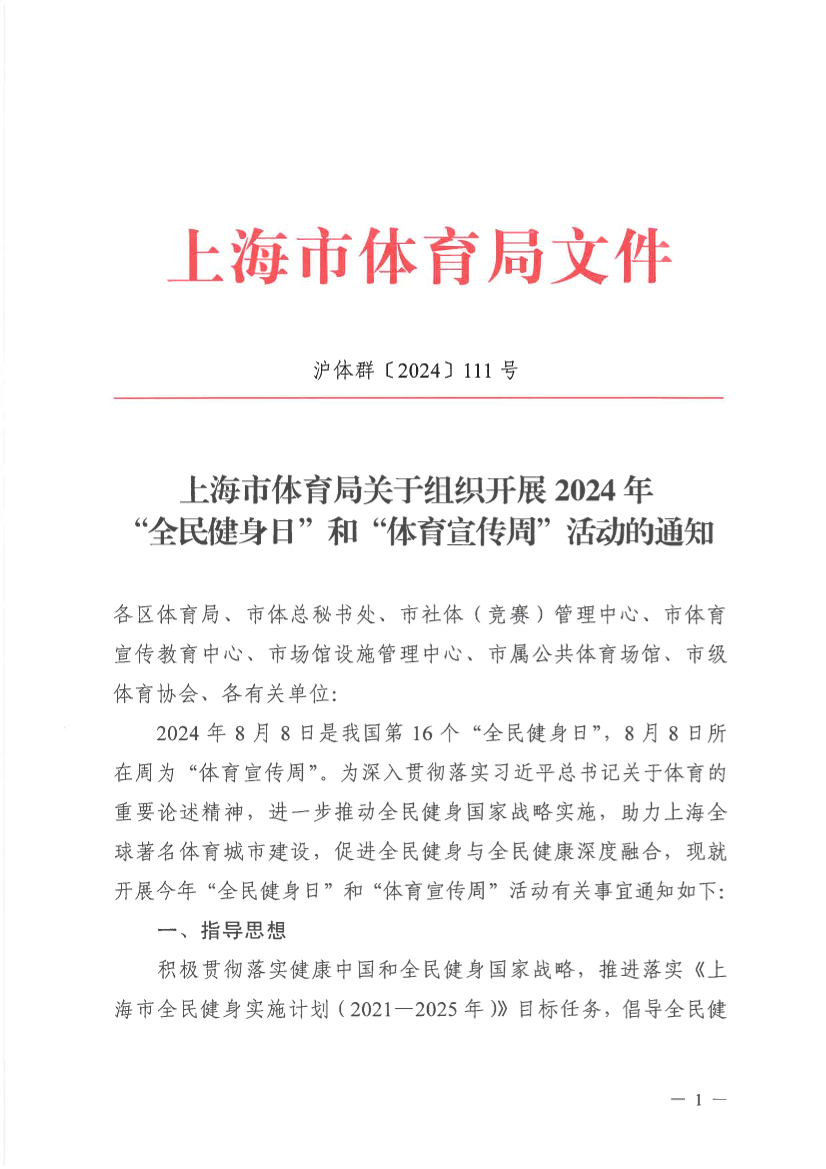 2024年8月8日是我国第16个“全民健身日”,8月8日所在周为“体育宣传周”。为深入贯彻落实习近平总书记关于体育的重要论述精神,进一步推动全民健身国家战略实施,助力上海全球著名体育城市建设,促进全民健身与全民健康深度融合,现就开展今年“全民健身日”和“体育宣传周”活动有关事宜通知如下: