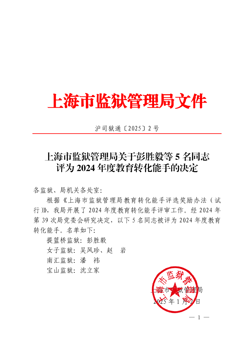 上海市监狱管理局关于彭胜毅等 5 名同志 评为 2024 年度教育转化能手的决定