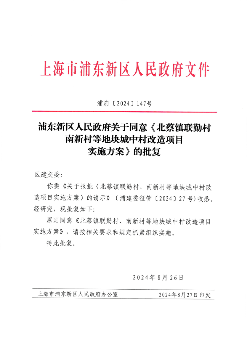 你委《关于报批〈北蔡镇联勤村、南新村等地块城中村改造项目实施方案〉的请示》(浦建委征管〔2024〕27号)收悉。经研究,现批复如下: