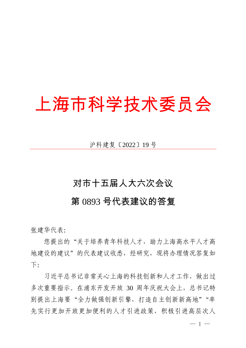 您提出的“关于培养青年科技人才,助力上海高水平人才高地建设的建议”的代表建议收悉,经研究,现将办理情况答复如下: