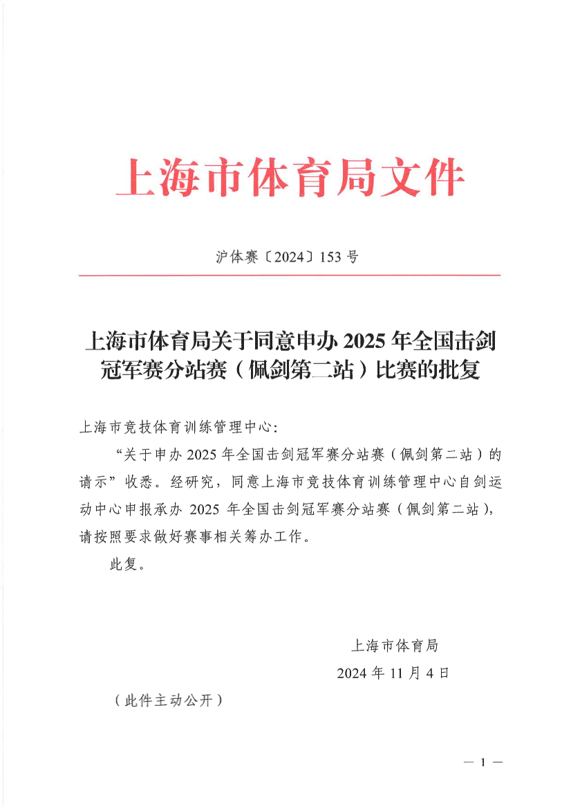 “关于申办2025年全国击剑冠军赛分站赛(佩剑第二站)的请示”收悉。经研究,同意上海市竞技体育训练管理中心自剑运动中心申报承办2025年全国击剑冠军赛分站赛(佩剑第二站),请按照要求做好赛事相关筹办工作。