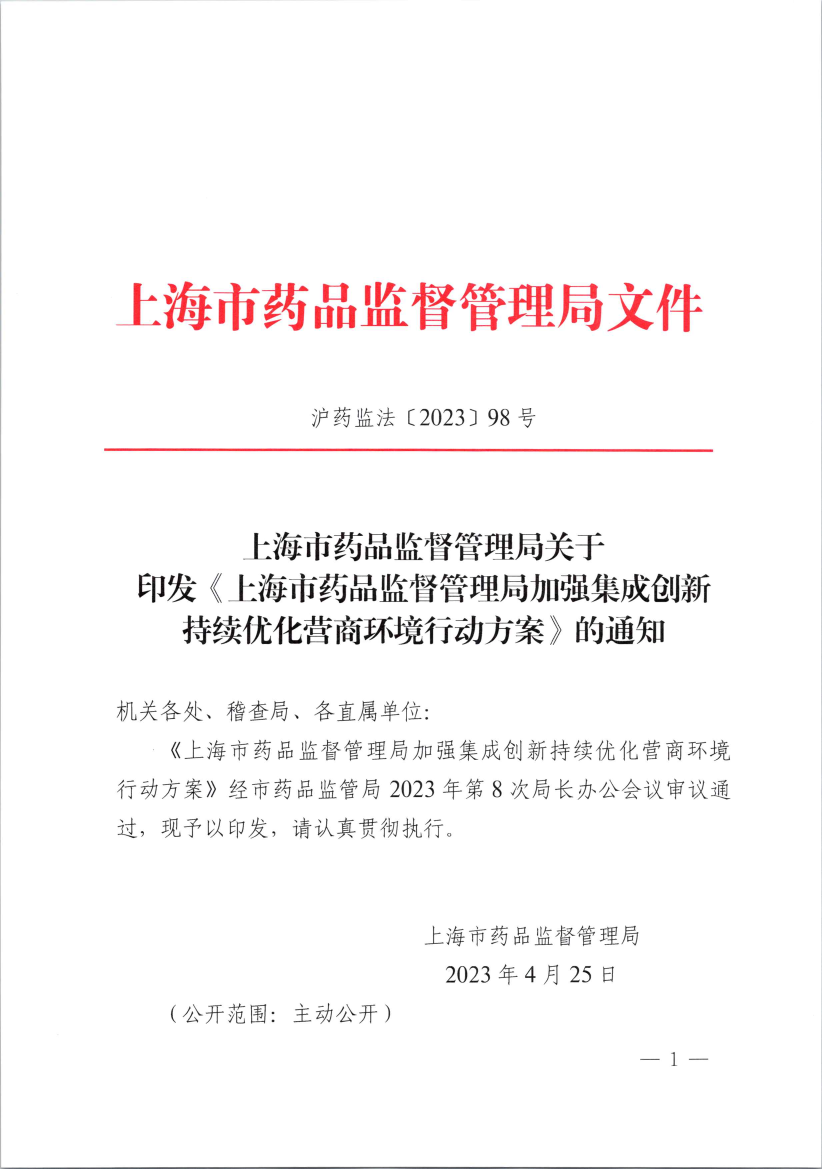 上海市药品监督管理局加强集成创新持续优化营商环境行动方案