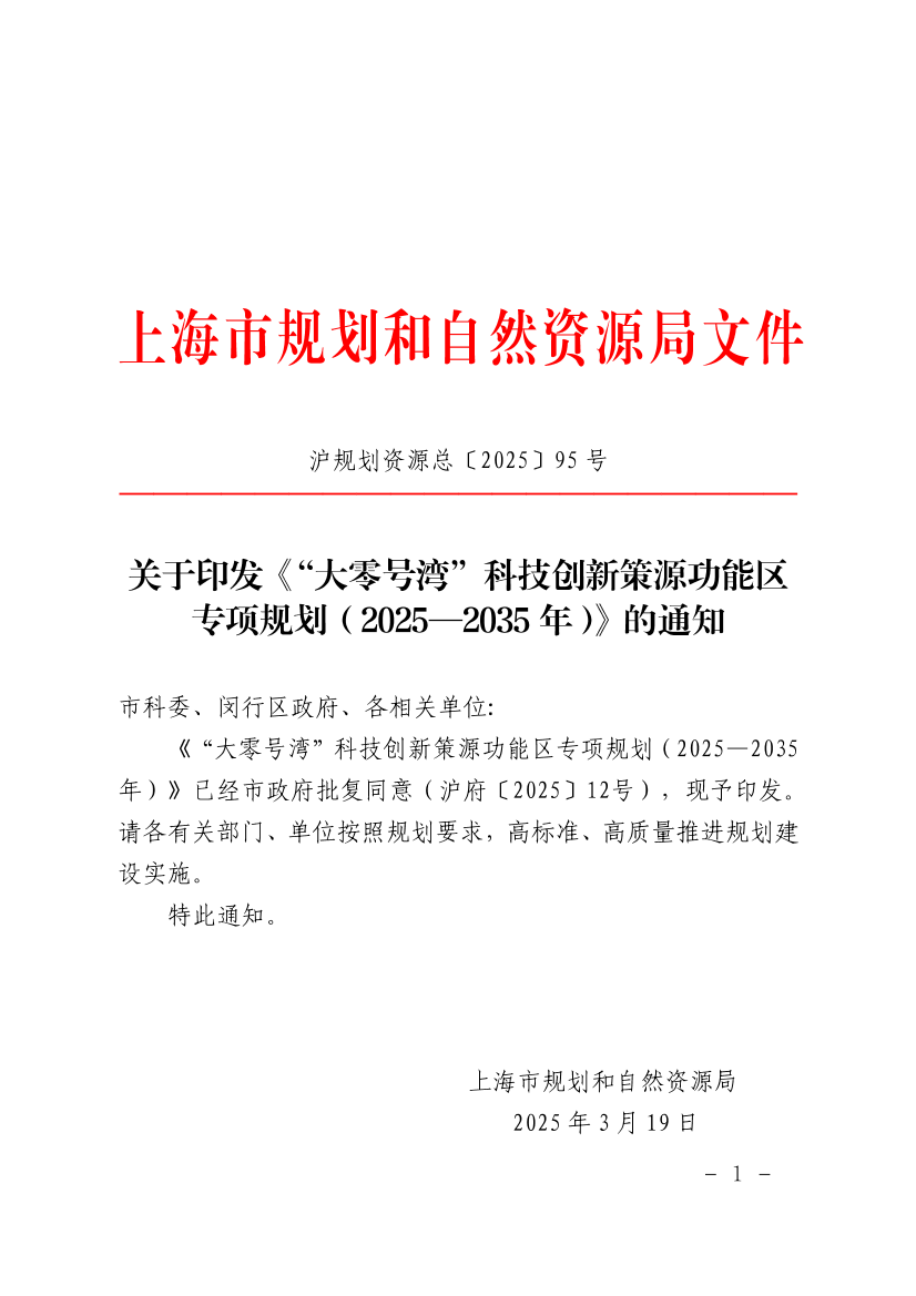 《“大零号湾”科技创新策源功能区专项规划(2025—2035年)》已经市政府批复同意(沪府〔2025〕12号),现予印发。请各有关部门、单位按照规划要求,高标准、高质量推进规划建设实施。