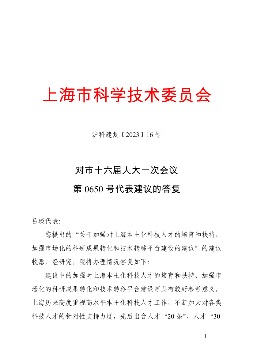 您提出的“关于加强对上海本土化科技人才的培育和扶持、加强市场化的科研成果转化和技术转移平台建设的建议”的建议收悉,经研究,现将办理情况答复如下: