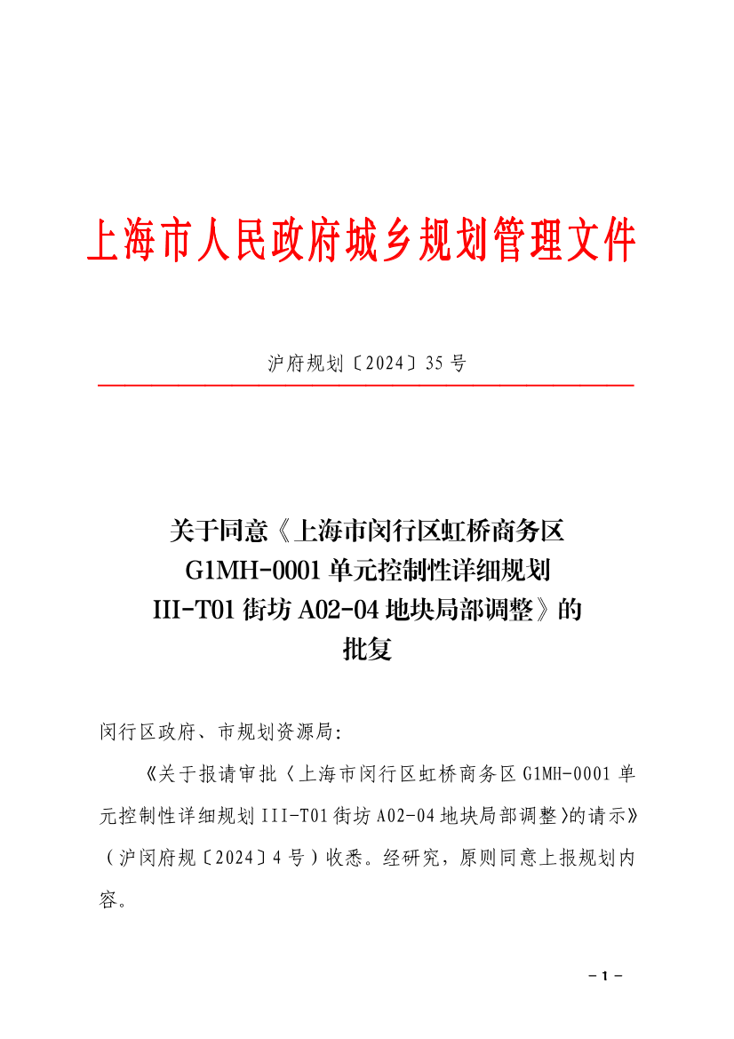 《关于报请审批〈上海市闵行区虹桥商务区G1MH-0001单元控制性详细规划III-T01街坊A02-04地块局部调整〉的请示》(沪闵府规〔2024〕4号)收悉。经研究,原则同意上报规划内容。