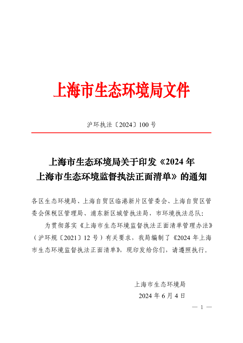 为贯彻落实《上海市生态环境监督执法正面清单管理办法》(沪环规〔2021〕12号)有关要求,我局编制了《2024年上海市生态环境监督执法正面清单》,现印发给你们,请遵照执行。