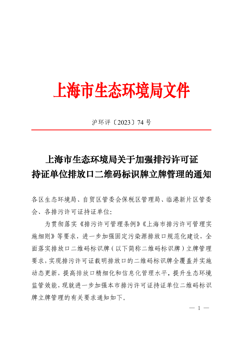 为贯彻落实《排污许可管理条例》《上海市排污许可管理实施细则》等要求,进一步加强固定污染源排放口规范化建设,全面落实排放口二维码标识牌(以下简称二维码标识牌)立牌管理要求,实现排污许可证载明排放口的二维码标识牌全覆盖并实施动态更新,提高排放口精细化和信息化管理水平,提升生态环境监管效能,现就进一步加强本市排污许可证持证单位二维码标识牌立牌管理的有关要求通知如下。