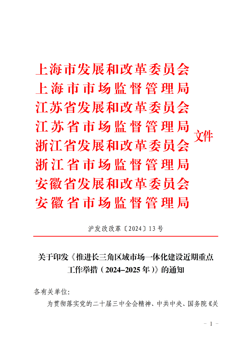 推进长三角区域市场一体化建设近期重点工作举措(2024-2025年)