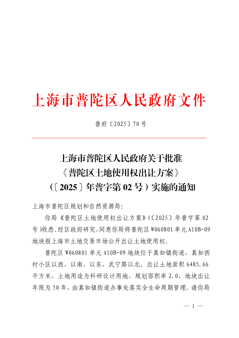 你局《普陀区土地使用权出让方案》(〔2025〕年普字第02号)收悉。经区政府研究,同意你局将普陀区W060801单元A10B-09地块报上海市土地交易市场公开出让土地使用权。