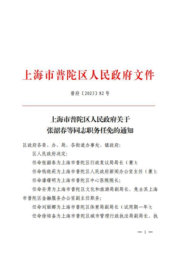 任命钱晓莉为上海市普陀区人民政府新闻办公室主任(兼);