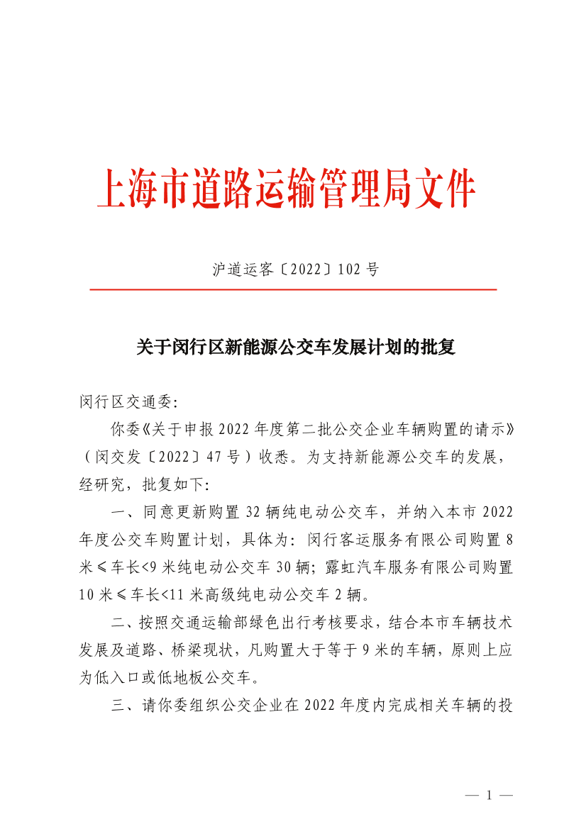 一、同意更新购置32辆纯电动公交车,并纳入本市2022年度公交车购置计划,具体为:闵行客运服务有限公司购置8米≤车长<9米纯电动公交车30辆;露虹汽车服务有限公司购置10米≤车长<11米高级纯电动公交车2辆。