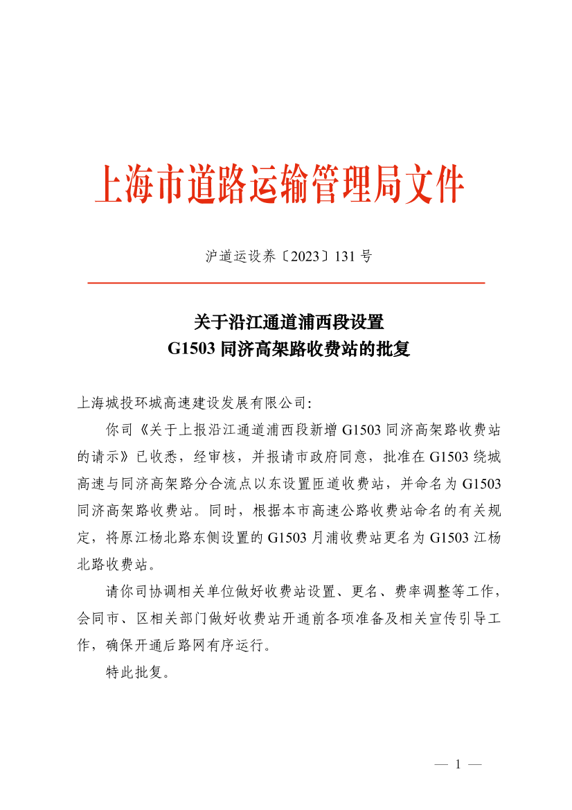 你司《关于上报沿江通道浦西段新增G1503同济高架路收费站的请示》已收悉,经审核,并报请市政府同意,批准在G1503绕城高速与同济高架路分合流点以东设置匝道收费站,并命名为G1503同济高架路收费站。同时,根据本市高速公路收费站命名的有关规定,将原江杨北路东侧设置的G1503月浦收费站更名为G1503江杨北路收费站。