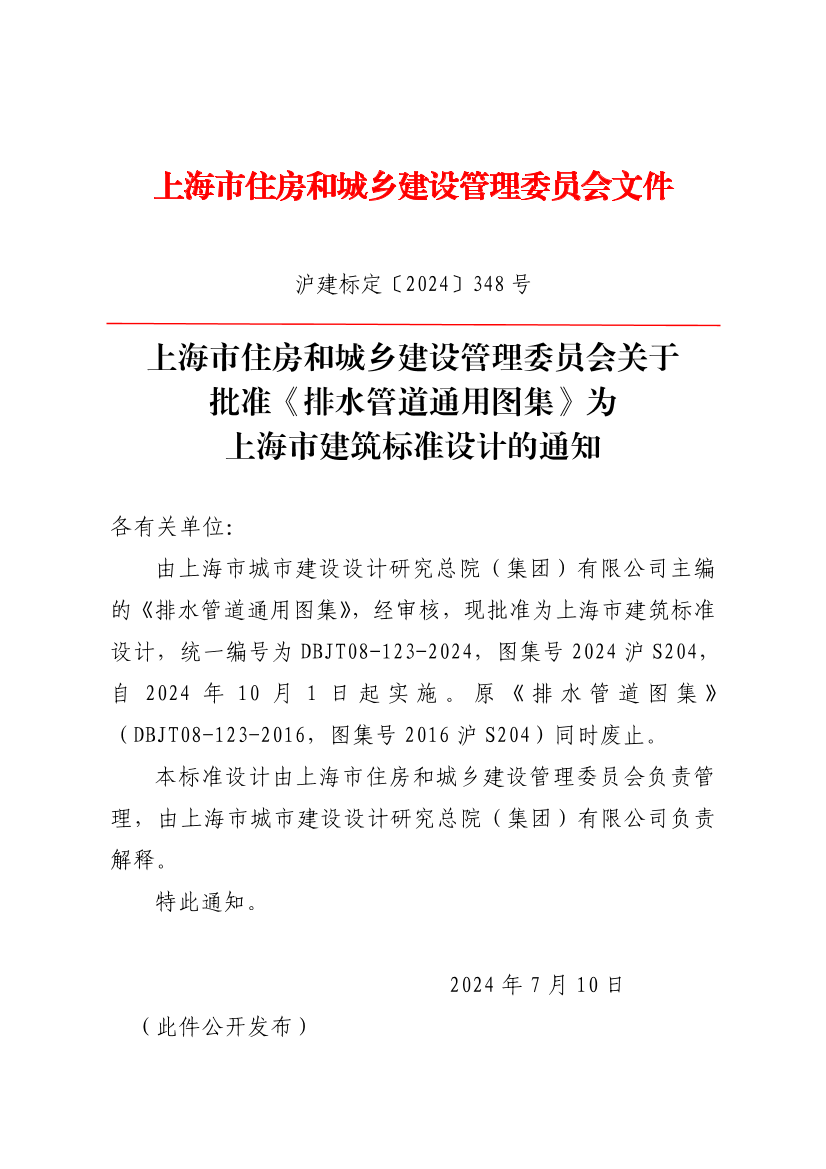 由上海市城市建设设计研究总院(集团)有限公司主编的《排水管道通用图集》,经审核,现批准为上海市建筑标准设计,统一编号为DBJT08-123-2024,图集号2024沪S204,自2024年10月1日起实施。原《排水管道图集》(DBJT08-123-2016,图集号2016沪S204)同时废止。