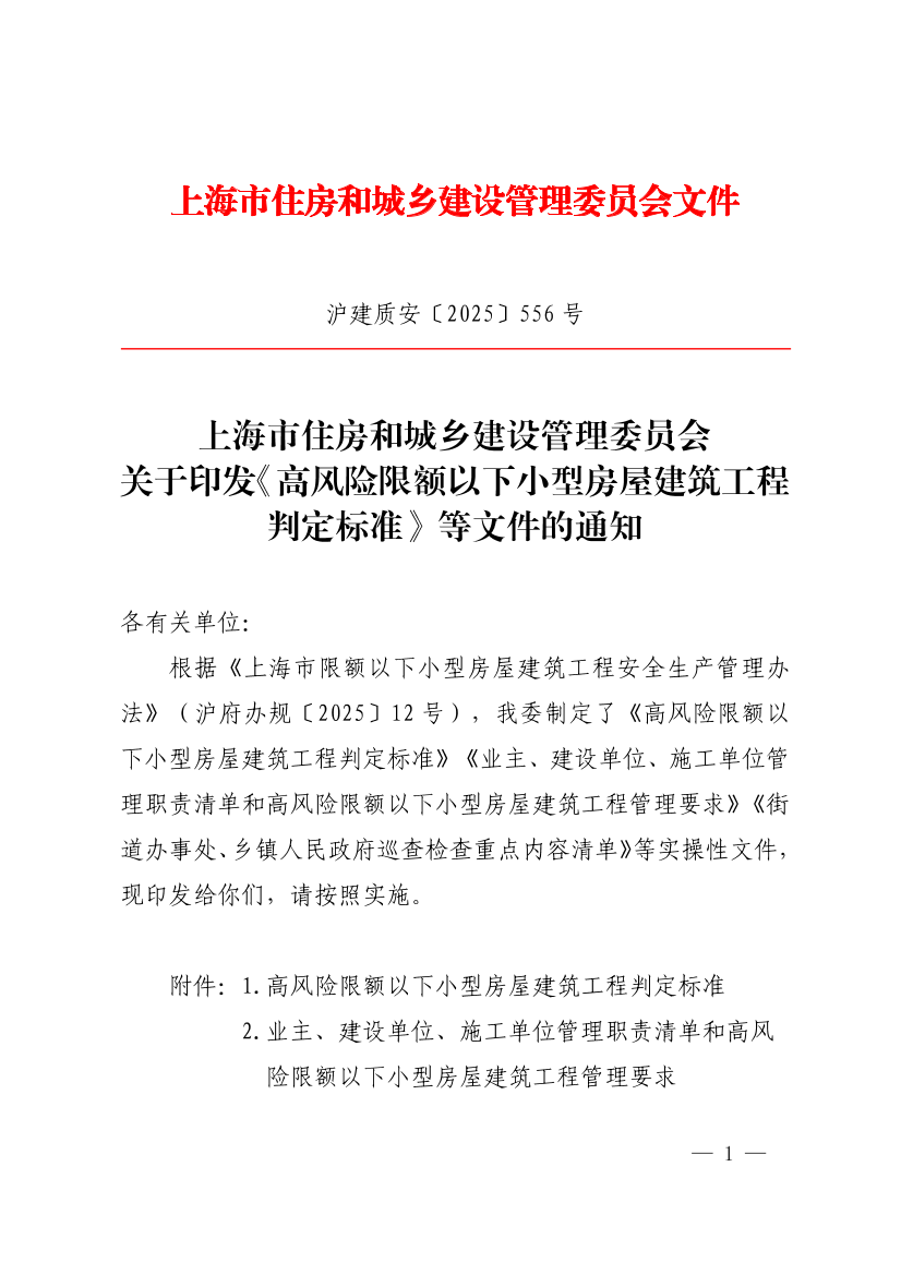 根据《上海市限额以下小型房屋建筑工程安全生产管理办法》(沪府办规〔2025〕12号),我委制定了《高风险限额以下小型房屋建筑工程判定标准》《业主、建设单位、施工单位管理职责清单和高风险限额以下小型房屋建筑工程管理要求》《街道办事处、乡镇人民政府巡查检查重点内容清单》等实操性文件,现印发给你们,请按照实施。