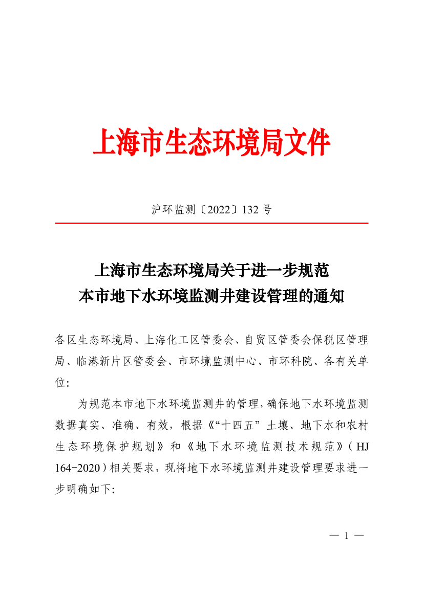 为规范本市地下水环境监测井的管理,确保地下水环境监测数据真实、准确、有效,根据《“十四五”土壤、地下水和农村生态环境保护规划》和《地下水环境监测技术规范》(HJ 164-2020)相关要求,现将地下水环境监测井建设管理要求进一步明确如下: