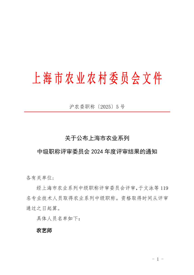 经上海市农业系列中级职称评审委员会评审,于文泳等119名专业技术人员取得农业系列中级职称。资格取得时间从评审通过之日起算。