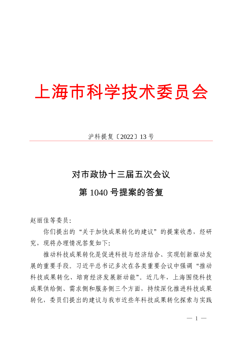 你们提出的“关于加快成果转化的建议”的提案收悉,经研究,现将办理情况答复如下:
