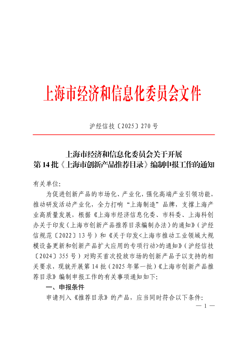 为促进创新产品的市场化、产业化,强化高端产业引领功能,推动研发活动产业化,全力打响“上海制造”品牌,支撑上海产业高质量发展,根据《上海市经济信息化委、市科委、上海科创办关于印发〈上海市创新产品推荐目录编制办法〉的通知》(沪经信规范〔2022〕13号)和《关于印发<上海市推动工业领域大规模设备更新和创新产品扩大应用的专项行动>的通知》(沪经信技〔2024〕355号)对购买首次投放市场的创新产品予以支持的相关要求,现就开展第14批(2025年第一批)《上海市创新产品推荐目录》编制申报工作的有关事项通知如下: