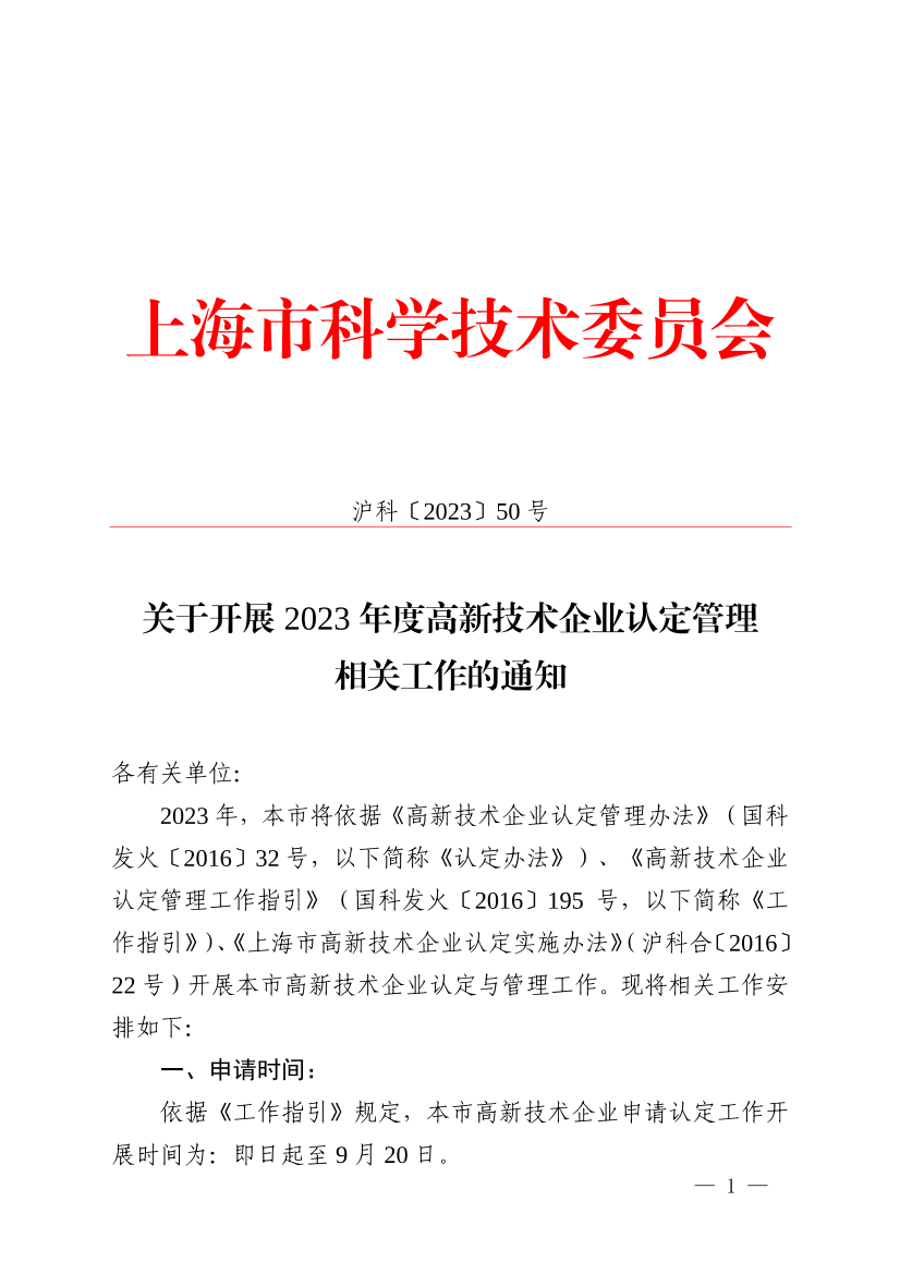 2023年,本市将依据《高新技术企业认定管理办法》(国科发火〔2016〕32号,以下简称《认定办法》)、《高新技术企业认定管理工作指引》(国科发火〔2016〕195号,以下简称《工作指引》)、《上海市高新技术企业认定实施办法》(沪科合〔2016〕22号)开展本市高新技术企业认定与管理工作。现将相关工作安排如下: