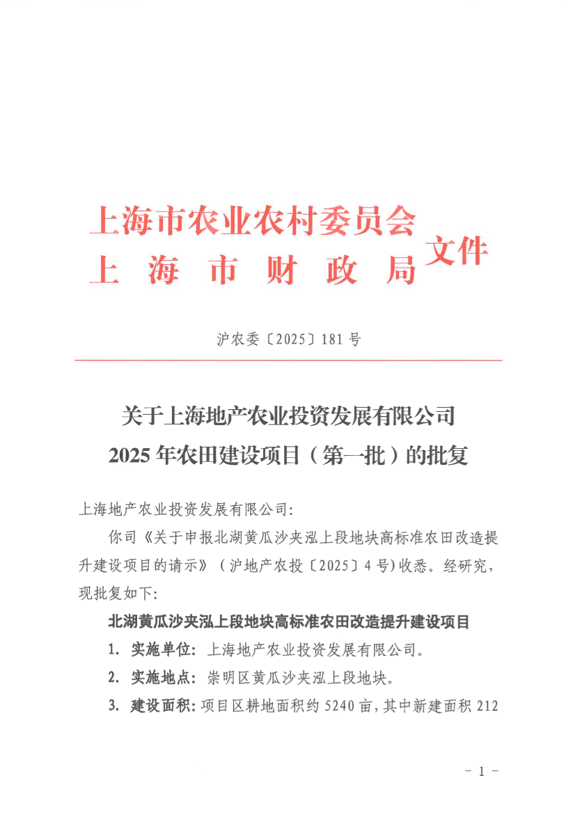 你司《关于申报北湖黄瓜沙夹泓上段地块高标准农田改造提升建设项目的请示》(沪地产农投〔2025〕4号)收悉。经研究,现批复如下: