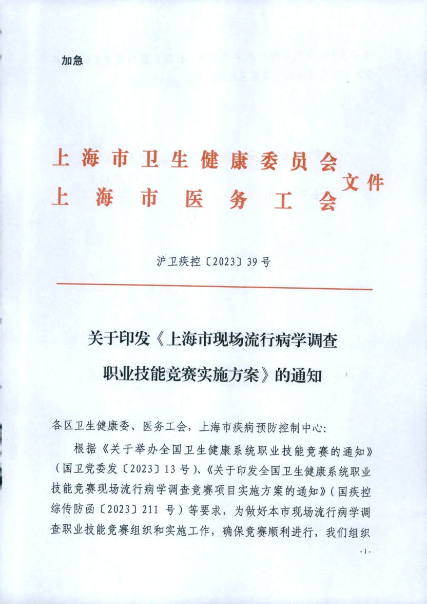 根据《关于举办全国卫生健康系统职业技能竞赛的通知》(国卫党委发〔2023〕13号)、《关于印发全国卫生健康系统职业技能竞赛现场流行病学调查竞赛项目实施方案的通知》(国疾控综传防函〔2023〕211号)等要求,为做好本市现场流行病学调查职业技能竞赛组织和实施工作,确保竞赛顺利进行,我们组织制定《上海市现场流行病学调查职业技能竞赛实施方案》。现将该方案印发给你们,请遵照执行。