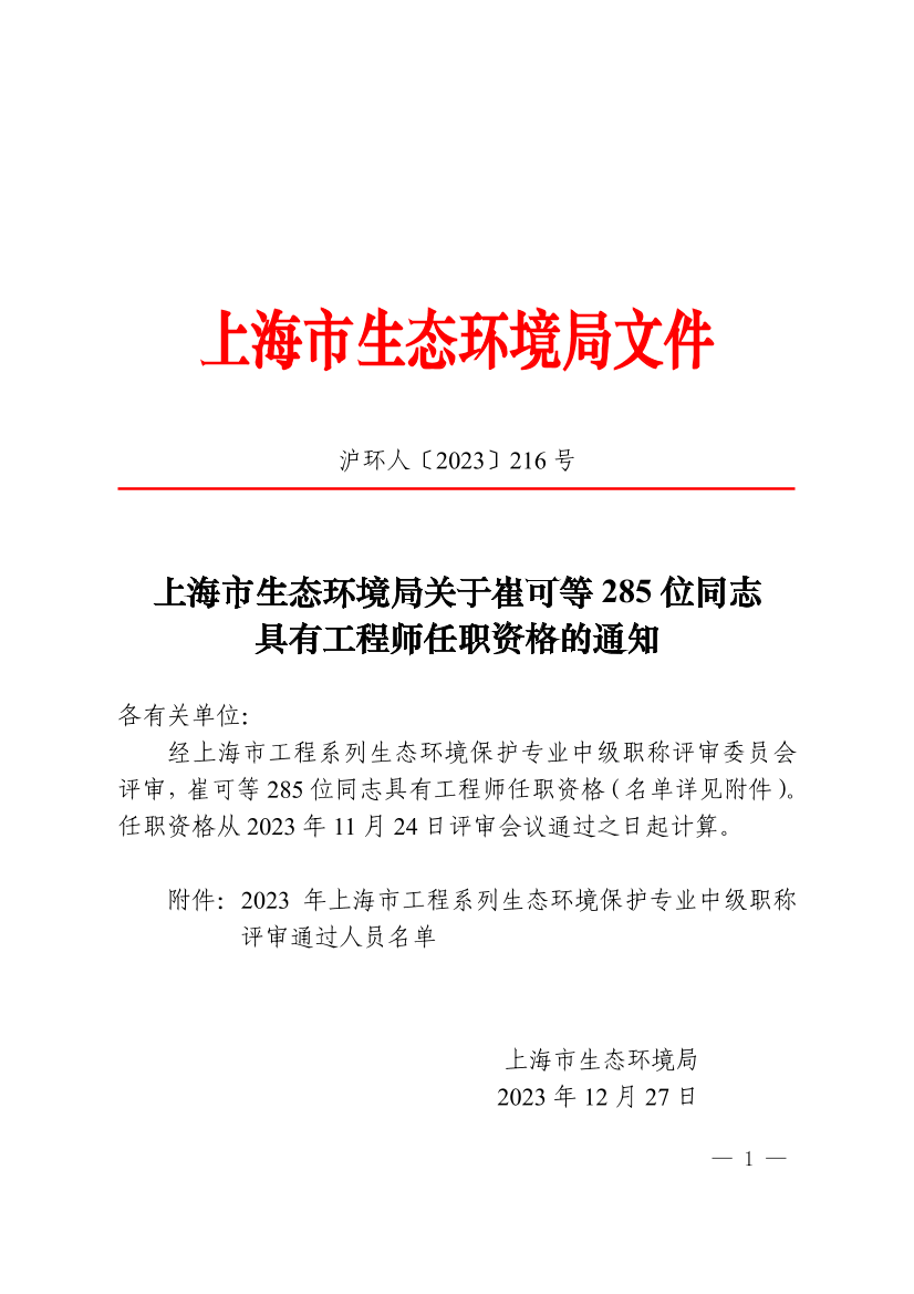 经上海市工程系列生态环境保护专业中级职称评审委员会评审,崔可等285位同志具有工程师任职资格(名单详见附件)。任职资格从2023年11月24日评审会议通过之日起计算。