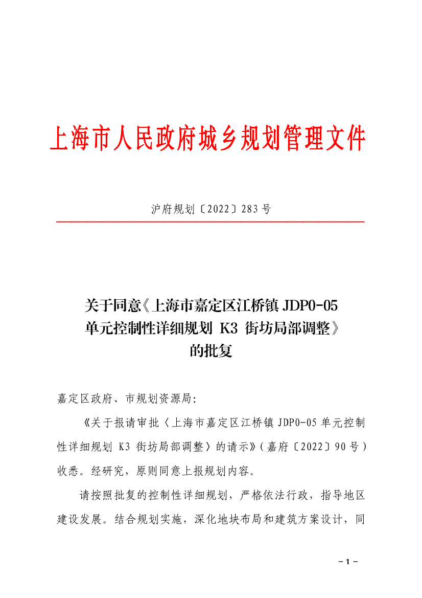 《关于报请审批〈上海市嘉定区江桥镇JDP0-05单元控制性详细规划 K3 街坊局部调整〉的请示》(嘉府〔2022〕90号)收悉。经研究,原则同意上报规划内容。