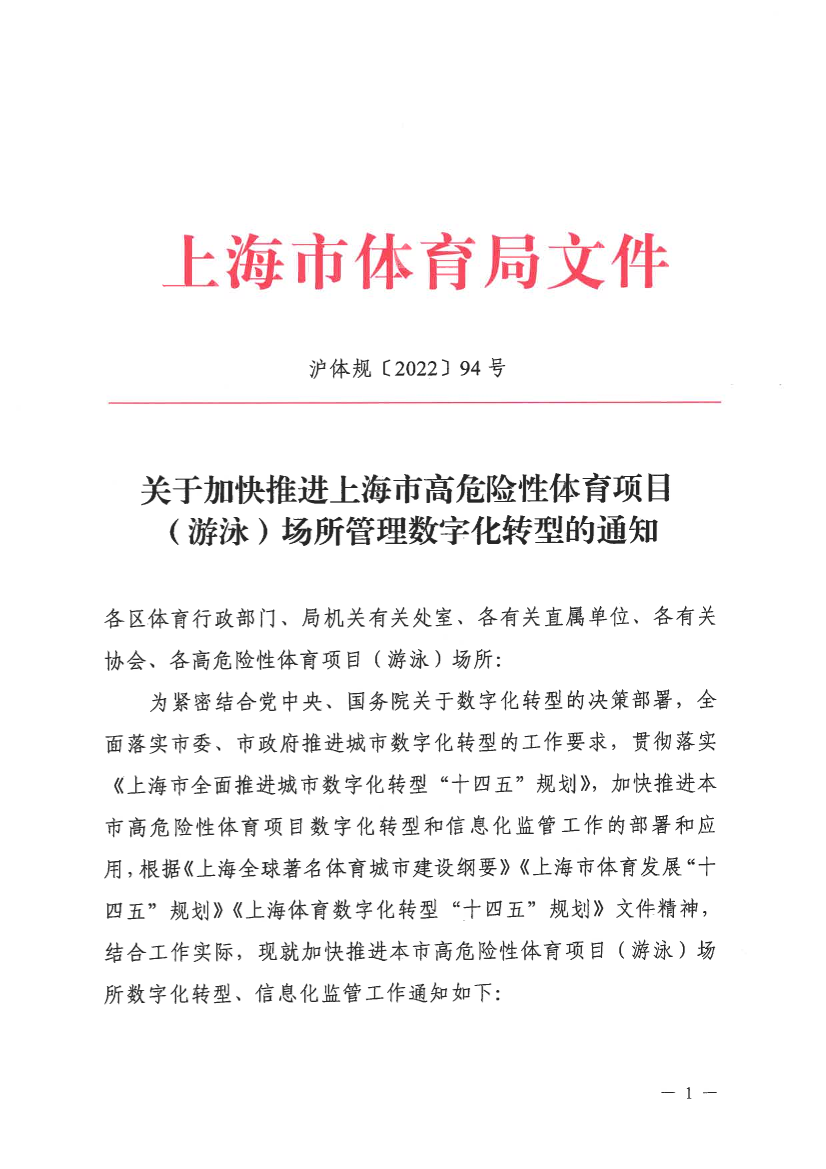 为紧密结合党中央、国务院关于数字化转型的决策部署,全面落实市委、市政府推进城市数字化转型的工作要求,贯彻落实《上海市全面推进城市数字化转型“十四五”规划》,加快推进本市高危险性体育项目数字化转型和信息化监管工作的部署和应用,根据《上海全球著名体育城市建设纲要》《上海市体育发展“十四五”规划》《上海体育数字化转型“十四五”规划》文件精神,结合工作实际,现就加快推进本市高危险性体育项目(游泳)场所数字化转型、信息化监管工作通知如下:
