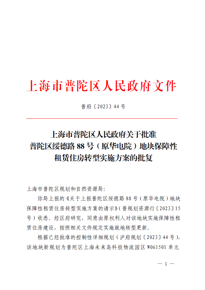 你局上报的《关于上报普陀区绥德路88号(原华电院)地块保障性租赁住房转型实施方案的请示》(普规划资源行〔2023〕15号)收悉。经区府研究,同意由原权利人对该地块实施保障性租赁住房建设,按照相关文件规定实施就地转型更新。