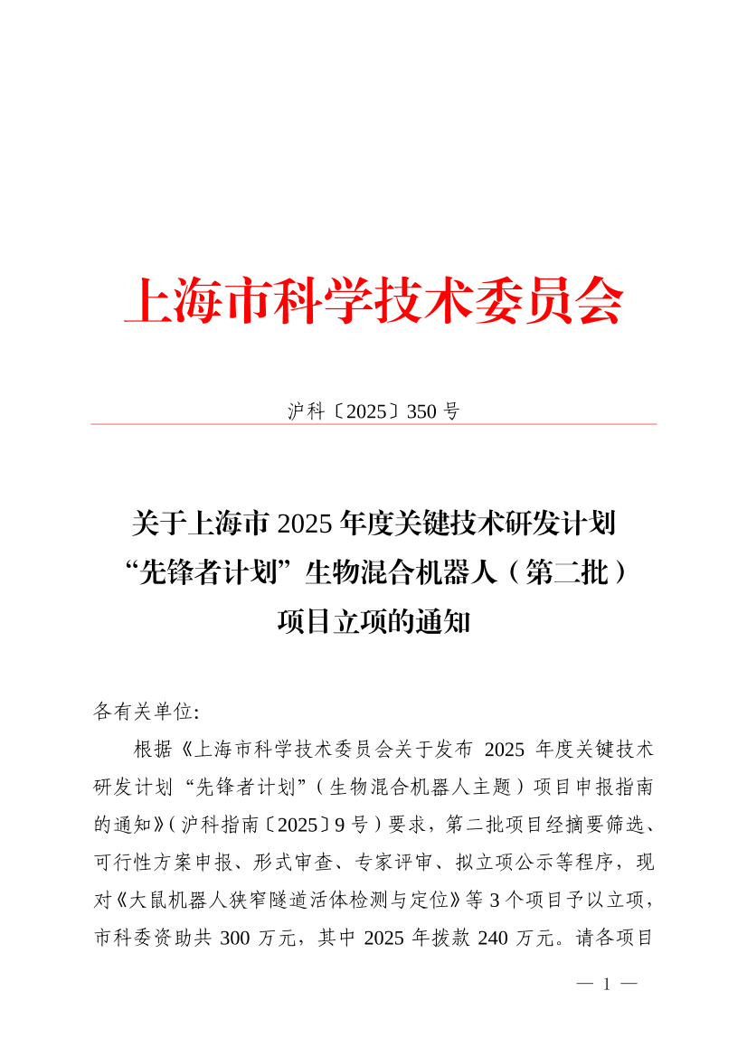 根据《上海市科学技术委员会关于发布2025年度关键技术研发计划“先锋者计划”(生物混合机器人主题)项目申报指南的通知》(沪科指南〔2025〕9号)要求,第二批项目经摘要筛选、可行性方案申报、形式审查、专家评审、拟立项公示等程序,现对《大鼠机器人狭窄隧道活体检测与定位》等3个项目予以立项,市科委资助共300万元,其中2025年拨款240万元。请各项目承担单位做好项目组织实施和管理工作,确保按期完成项目研究任务目标。