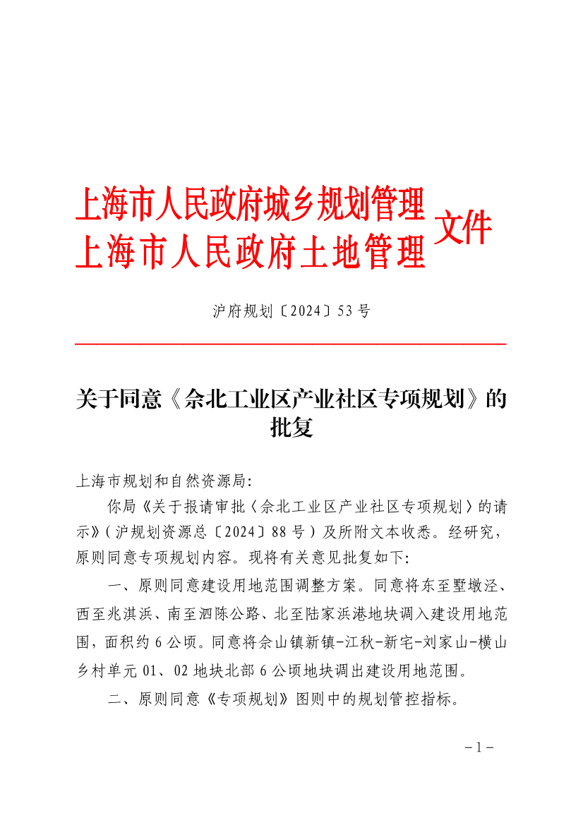 你局《关于报请审批〈佘北工业区产业社区专项规划〉的请示》(沪规划资源总〔2024〕88号)及所附文本收悉。经研究,原则同意专项规划内容。现将有关意见批复如下: