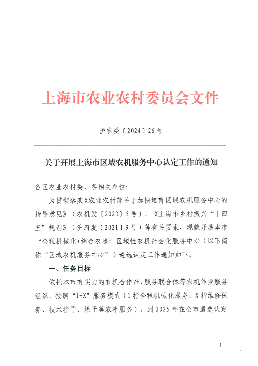 为贯彻落实《农业农村部关于加快培育区域农机服务中心的指导意见》(农机发〔2023〕5号)、《上海市乡村振兴“十四五”规划》(沪府发〔2021〕9号)等有关要求,现就开展本市“全程机械化+综合农事”区域性农机社会化服务中心(以下简称“区域农机服务中心”)遴选认定工作通知如下。