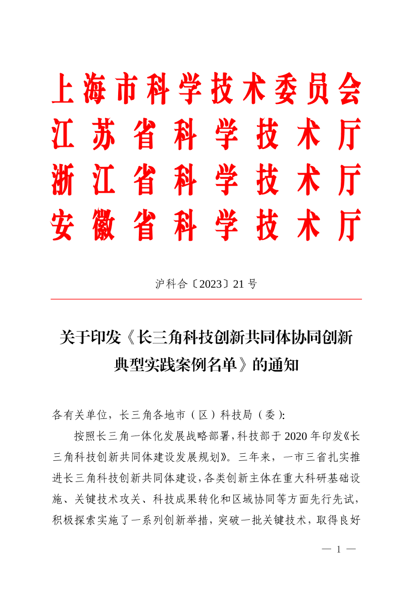 按照长三角一体化发展战略部署,科技部于2020年印发《长三角科技创新共同体建设发展规划》。三年来,一市三省扎实推进长三角科技创新共同体建设,各类创新主体在重大科研基础设施、关键技术攻关、科技成果转化和区域协同等方面先行先试,积极探索实施了一系列创新举措,突破一批关键技术,取得良好的经济和社会效益,形成一批可复制、可推广的经验做法。经前期一市三省科技主管部门公开征集、单位自主申报或地市(区)科技主管部门推荐、专家遴选等流程,凝练10项协同创新典型实践案例,详见附件清单。现予以发布,供相关单位参考借鉴。