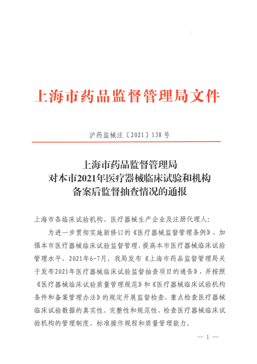 为进一步贯彻实施新修订的《医疗器械监督管理条例》,加强本市医疗器械临床试验监督管理,提高本市医疗器械临床试验管理水平,2021年6-7月,我局发布《上海市药品监督管理局关于发布2021年医疗器械临床试验监督抽查项目的通告》,并按照《医疗器械临床试验质量管理规范》和《医疗器械临床试验机构条件和备案管理办法》的规定开展监督检查,重点检查医疗器械临床试验数据的真实性、完整性和规范性,检查医疗器械临床试验机构的管理制度、标准操作规程和质量管理能力。